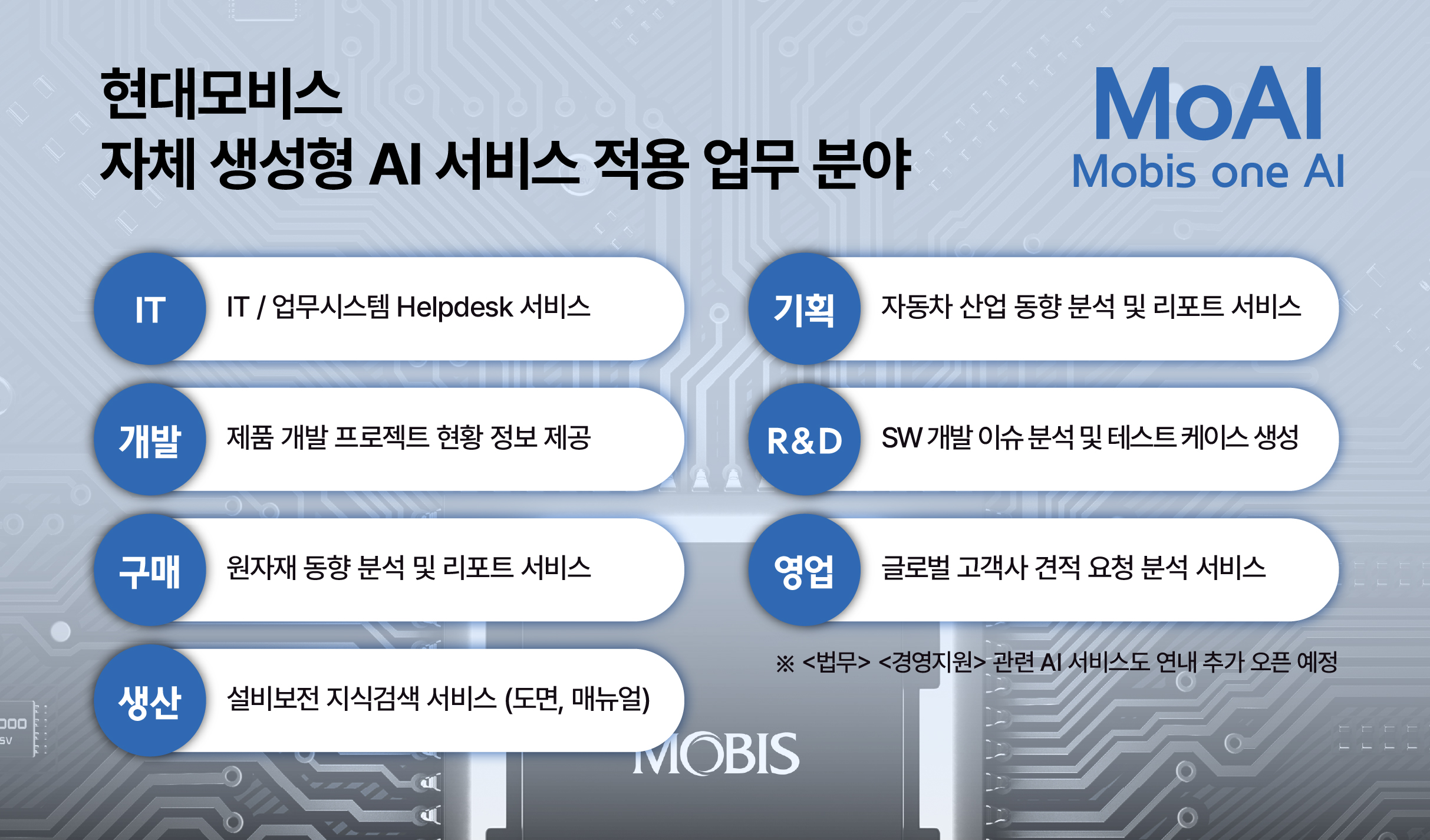 현대모비스는 진화하는 생성형 AI의 장점을 살려 사용 과정에서 임직원들의 피드백을 적극 반영해 서비스의 수준을 높이고 업무 적용 분야도 점진적으로 확대할 예정이다. 현재는 부서별 필요성을 감안해 연구개발, IT, 영업 등 7개 업무 분야에 적용 중이지만 올해 안에 법무와 경영지원 등 다른 부문에도 서비스 적용을 준비 중이다.